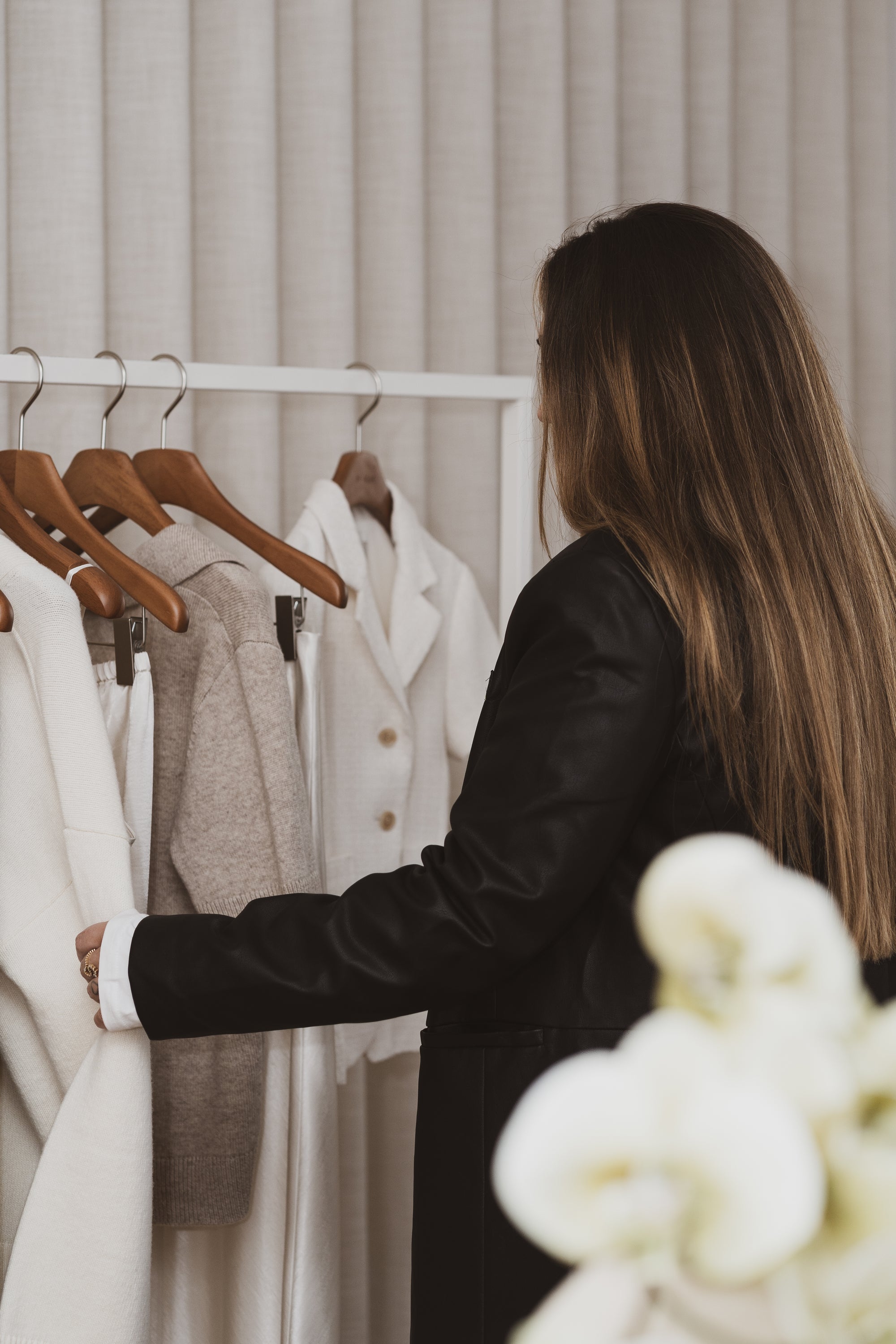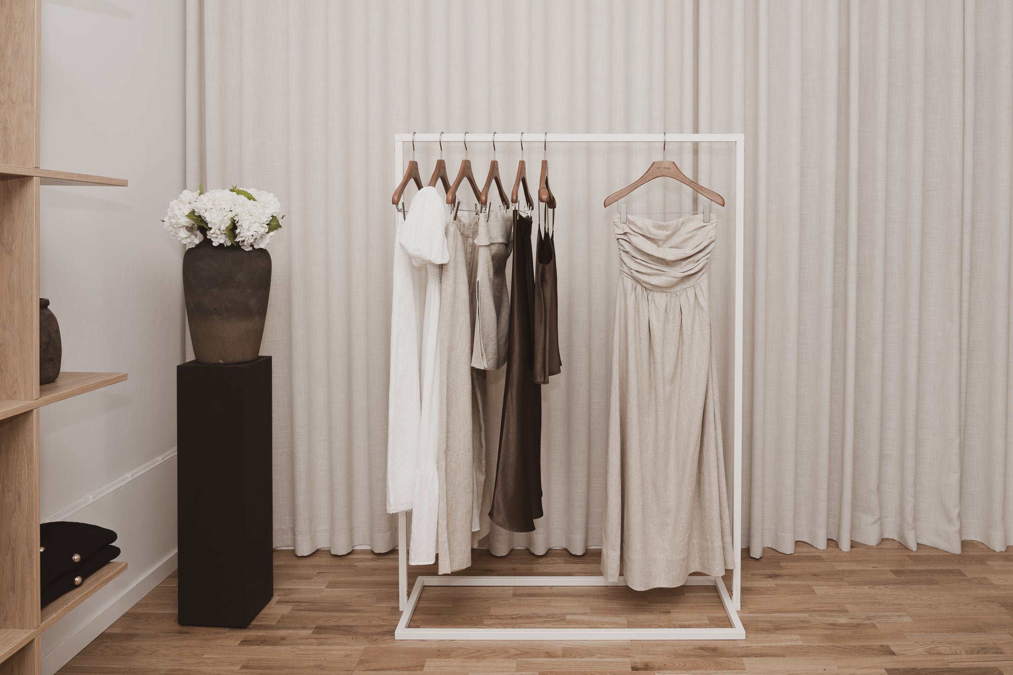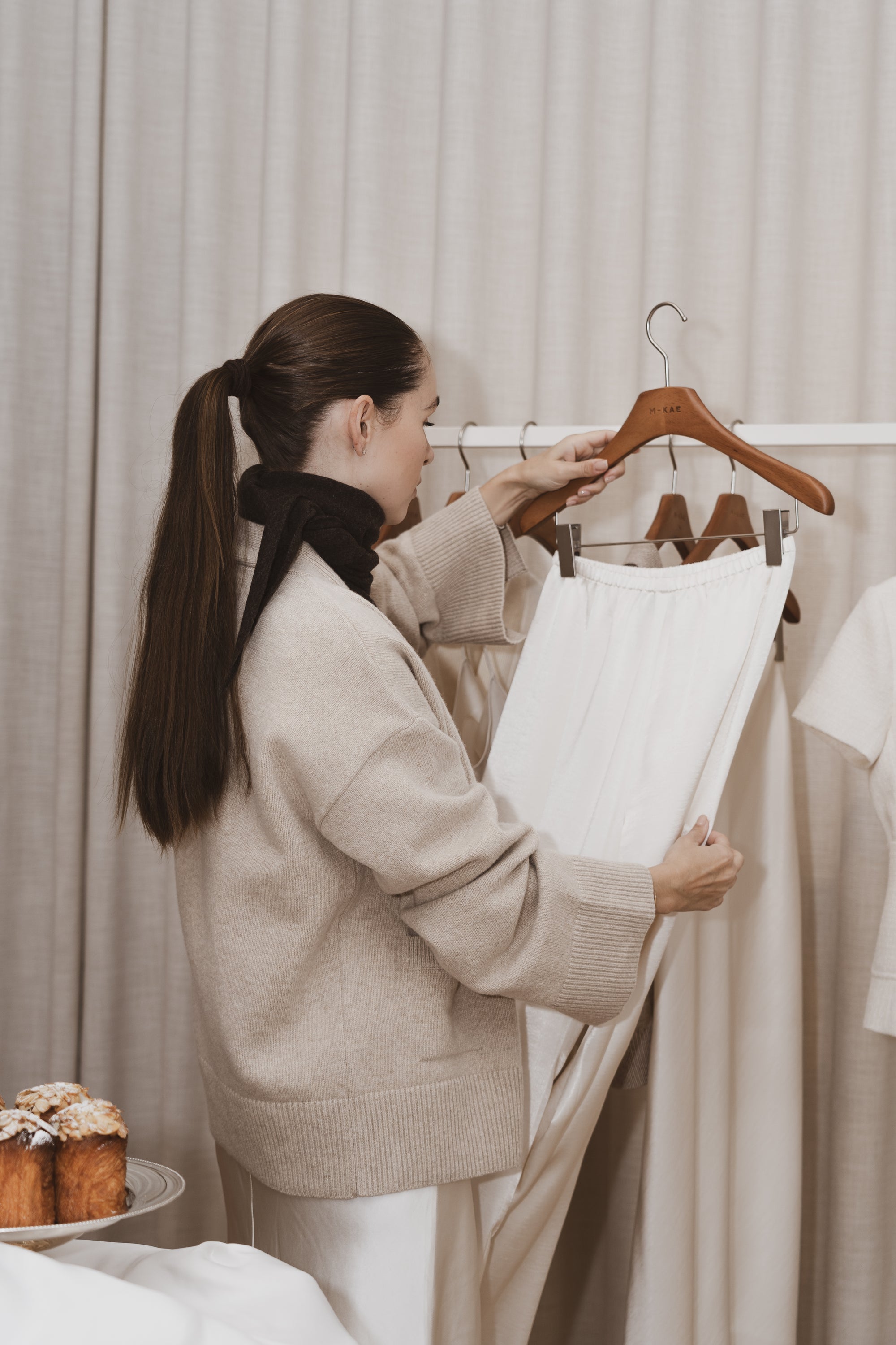 Over freshly brewed coffee and beautiful pastries from Apotek 57, our SS25 collection came to life in our intimate Copenhagen studio. Guests were invited to slow down and explore — moving between rails of fluid satin silhouettes, delicate embroidered details, and airy linen pieces that captured the spirit of the upcoming season. Protected from the cold outside, the studio offered more than just a showcase - it became a simple meeting point for closeness, shaped by our belief in creativity and community.